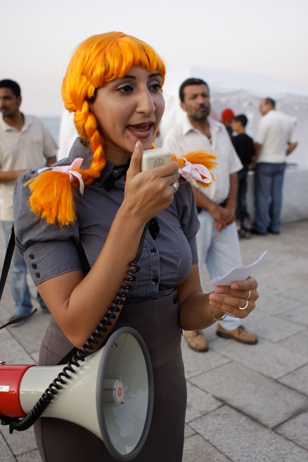 Framför vår Empower Station, ett tält bestående av ett avskilt rum och ett marknadsstånd, ropades inkomna svar ut i megafoner på engelska och arabiska.